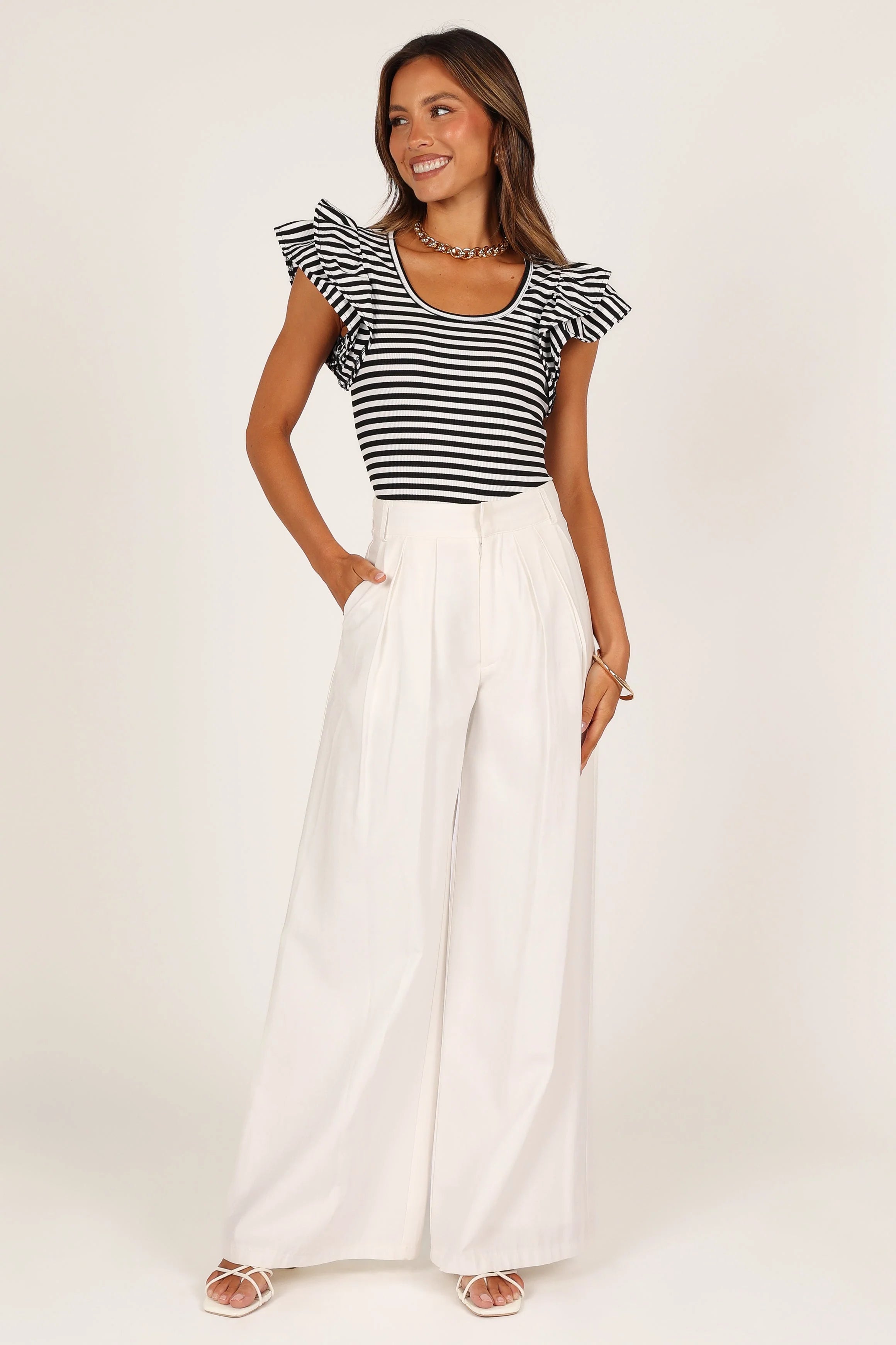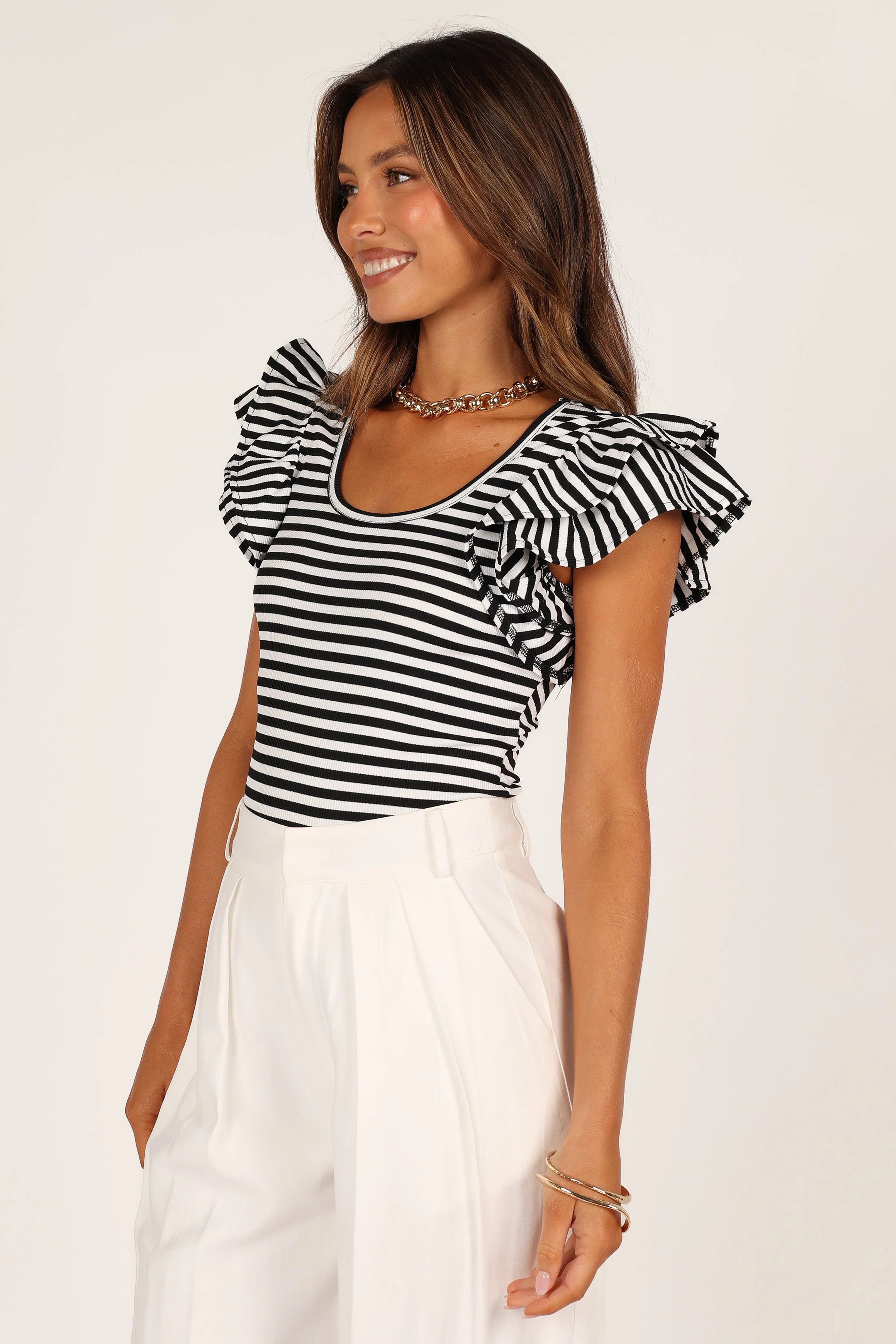 DETAILS This cropped length top is the perfect way to dress up a casual look with its playful stripe print design and flirty ruffle sleeve details. The round neckline, short sleeves, and stretch ribbed knit fabric make it comfortable and easy to wear.
