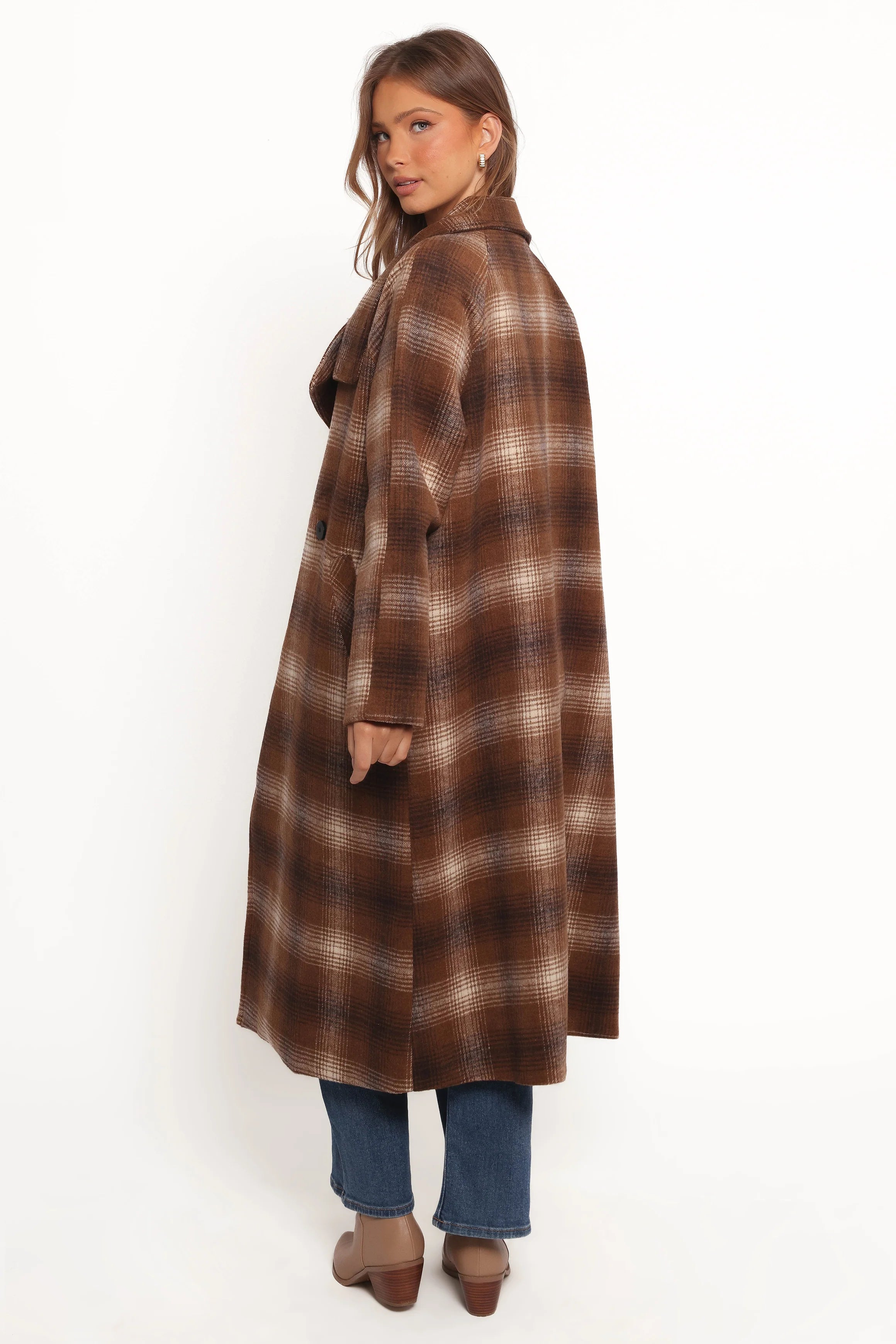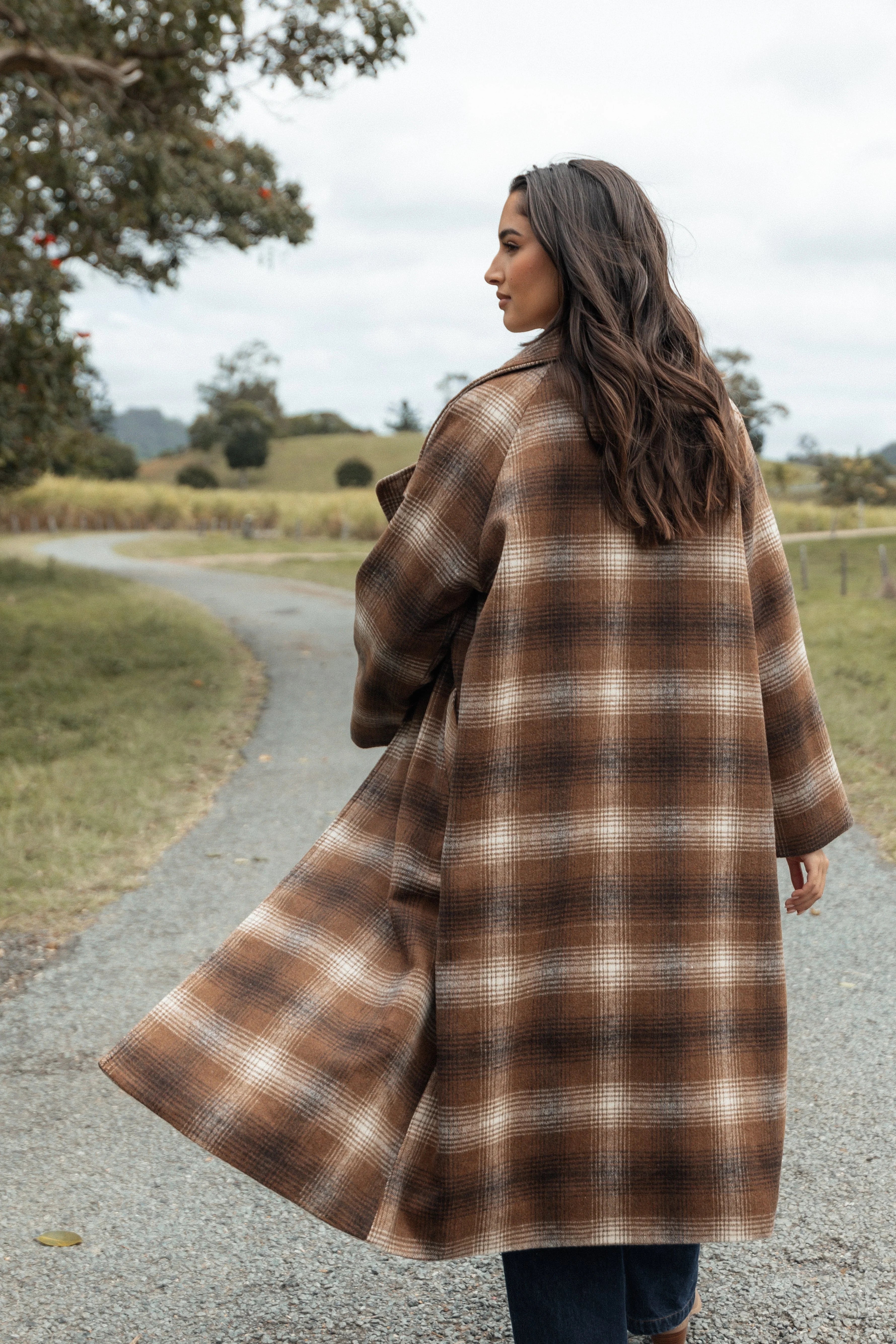 DETAILS Slip into timeless elegance with the Maya Long Coat in Brown Check, a staple piece that envelops you in warmth, offering a soft wool-like feel without compromising on style. The two-button closure adds a classic touch, complementing the functional front pockets designed for both style and practicality.