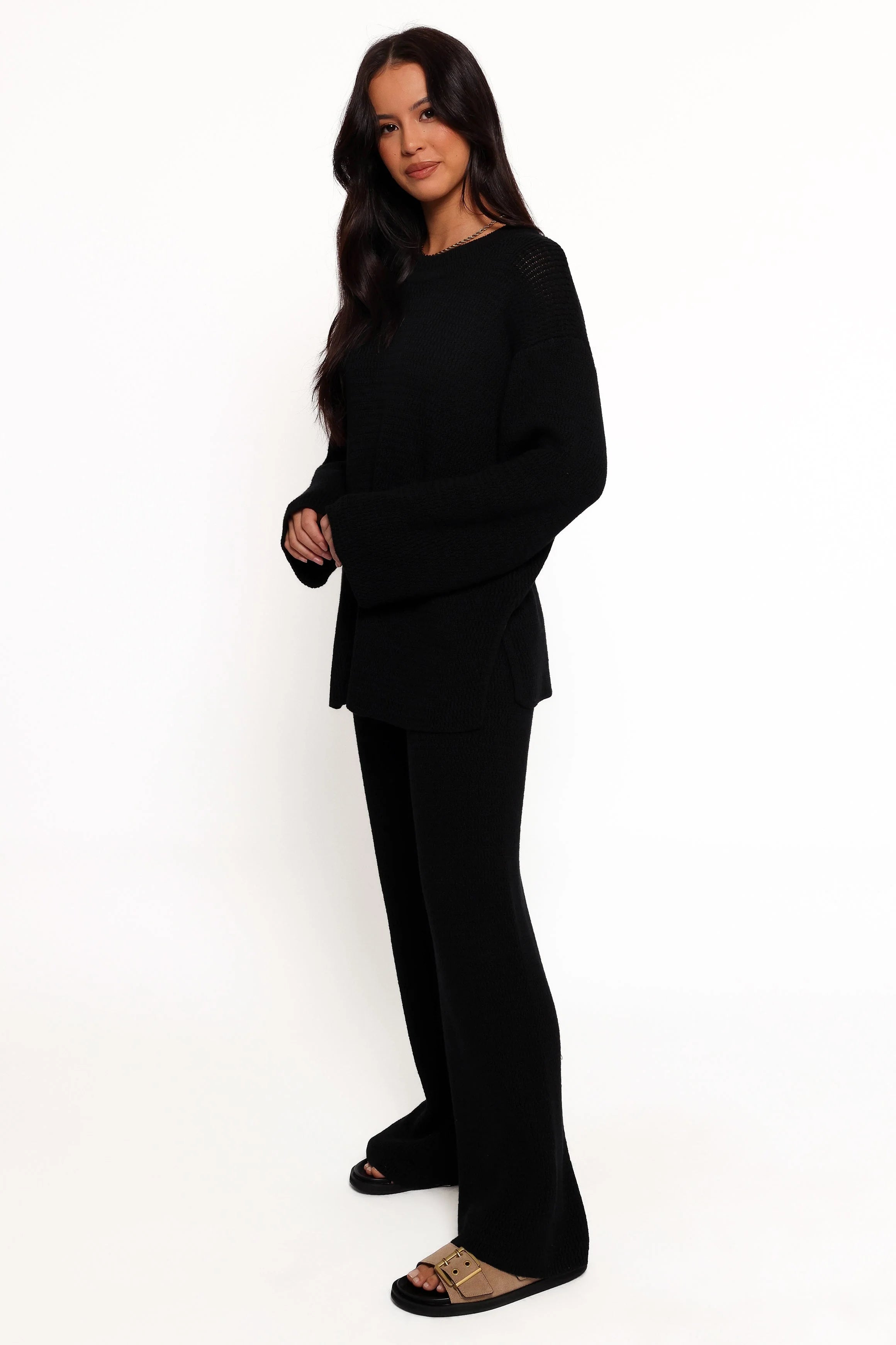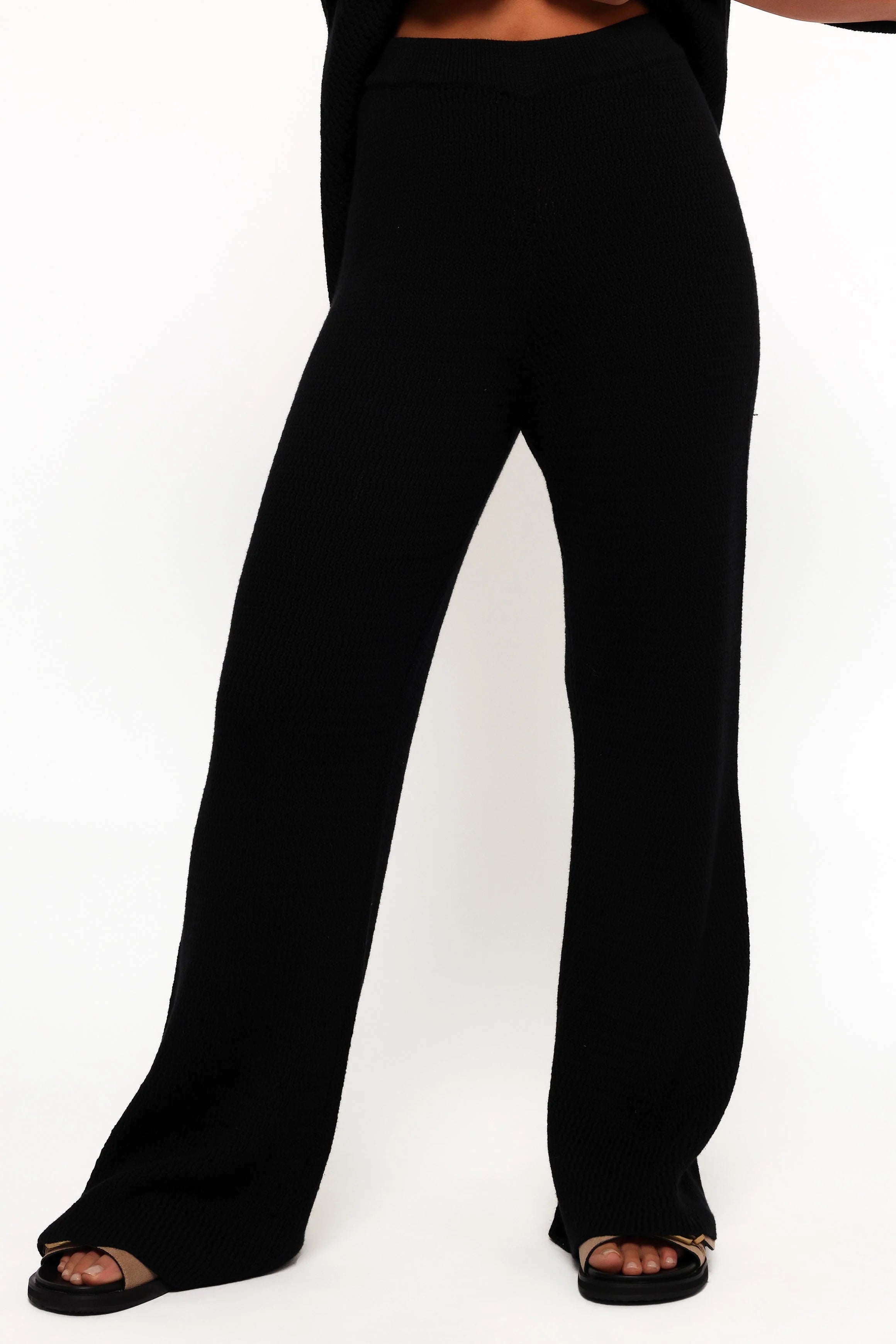 | DETAILS A seamless blend of modern comfort and timeless design, these pants promise to elevate your wardrobe with their flattering knitted style. The high waist, embraced by an elasticised band, ensures a secure and cozy fit.