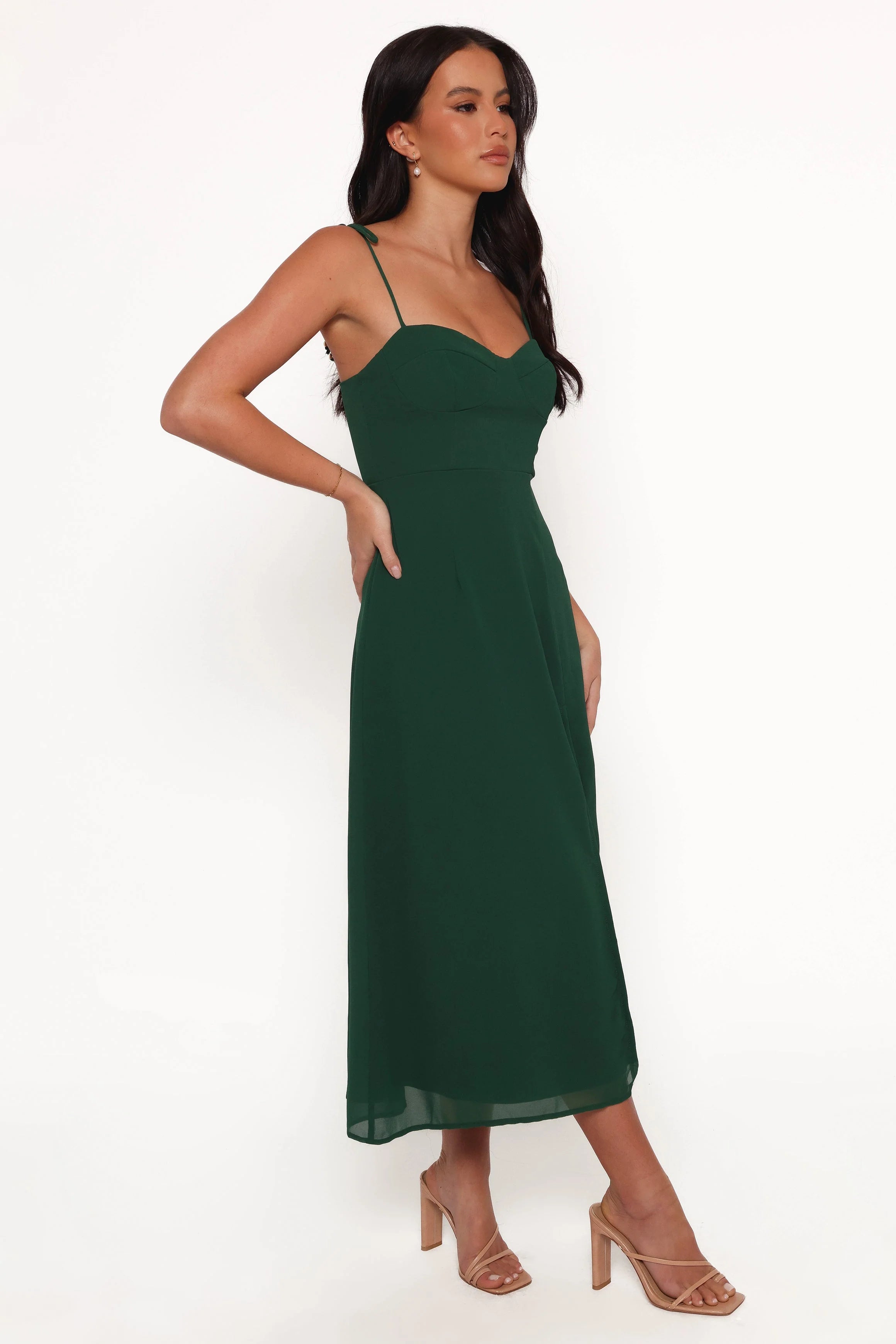 | DETAILS Are you looking for the perfect midi dress to make a statement? Look no further than this midi beauty! Featuring a sweetheart neckline, thin tie close straps and back shirred panel for extra comfort, this dress is designed with your smaller bust in mind.