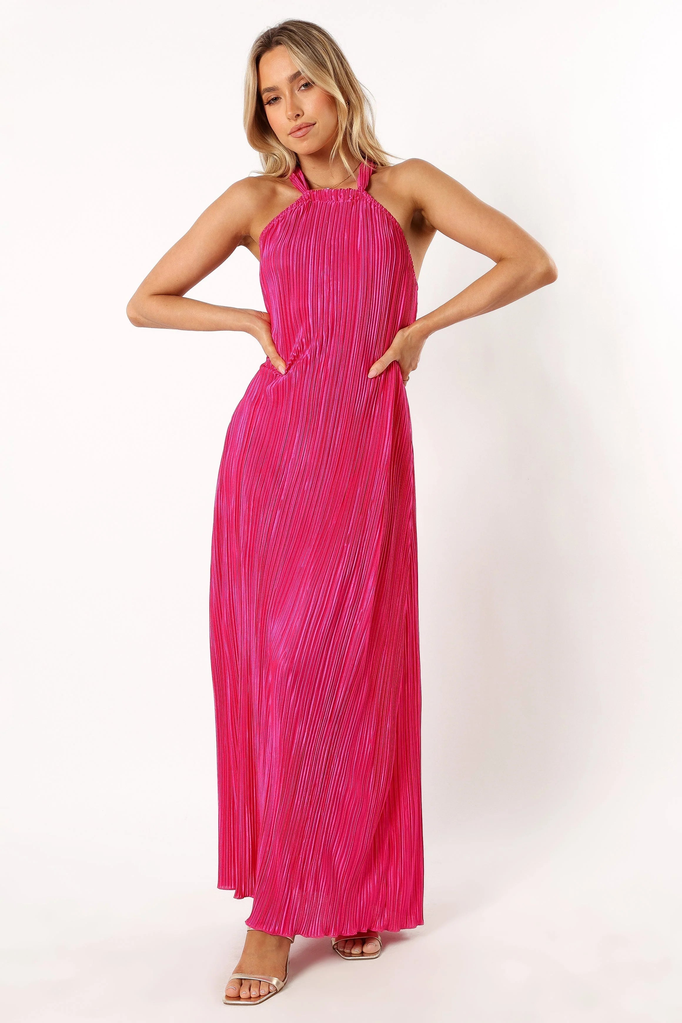 DETAILS This season, update your wardrobe with this stunning midi dress that combines effortless style and feminine charm. Featuring a classic halterneck style neckline and sleeveless design, the dress is made from light plisse material for an elegant drape.