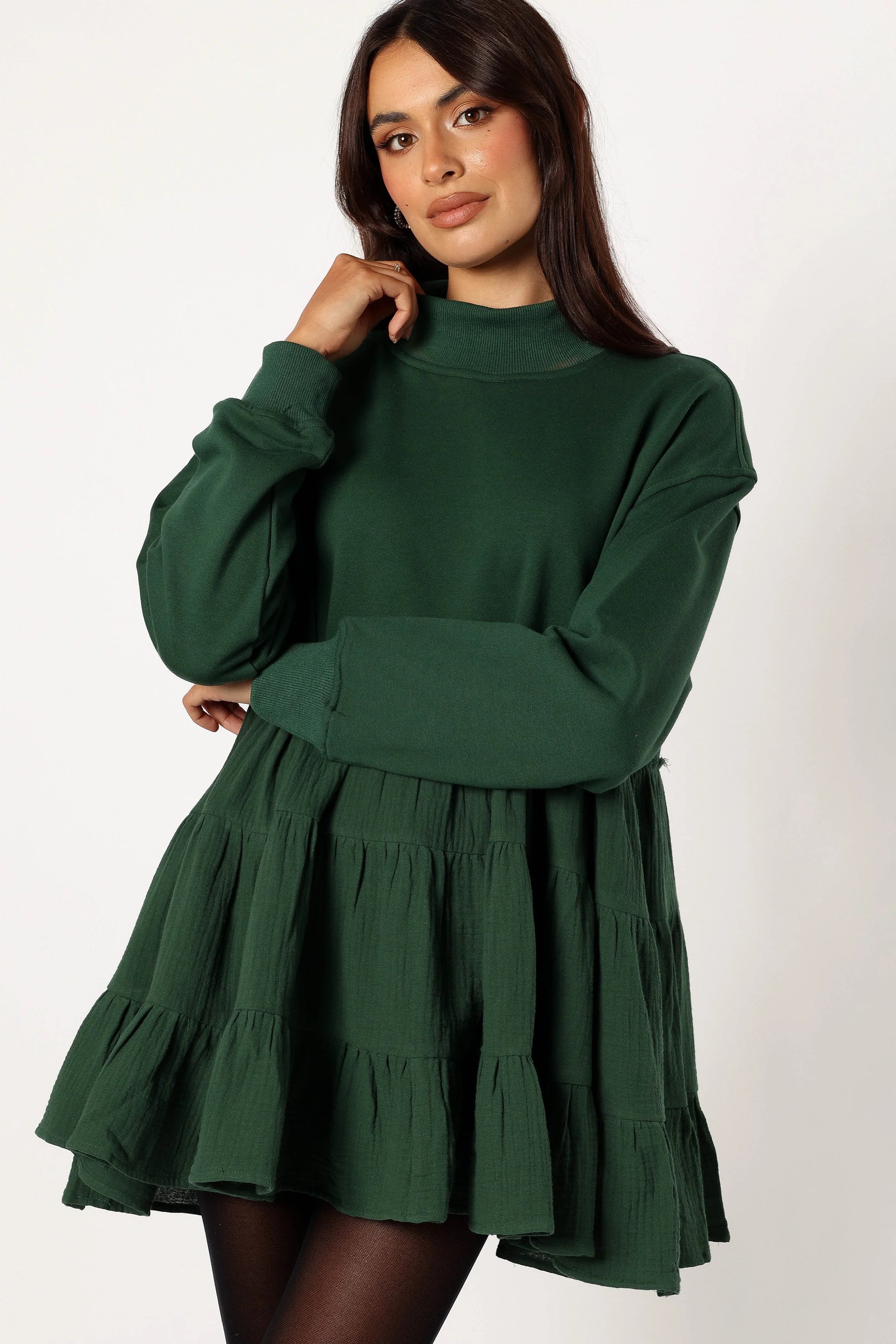 DETAILS This season, step out in style with this must-have mini dress. A flattering above knee length and turtle neckline, it features a long sleeves with ribbed cuffs.