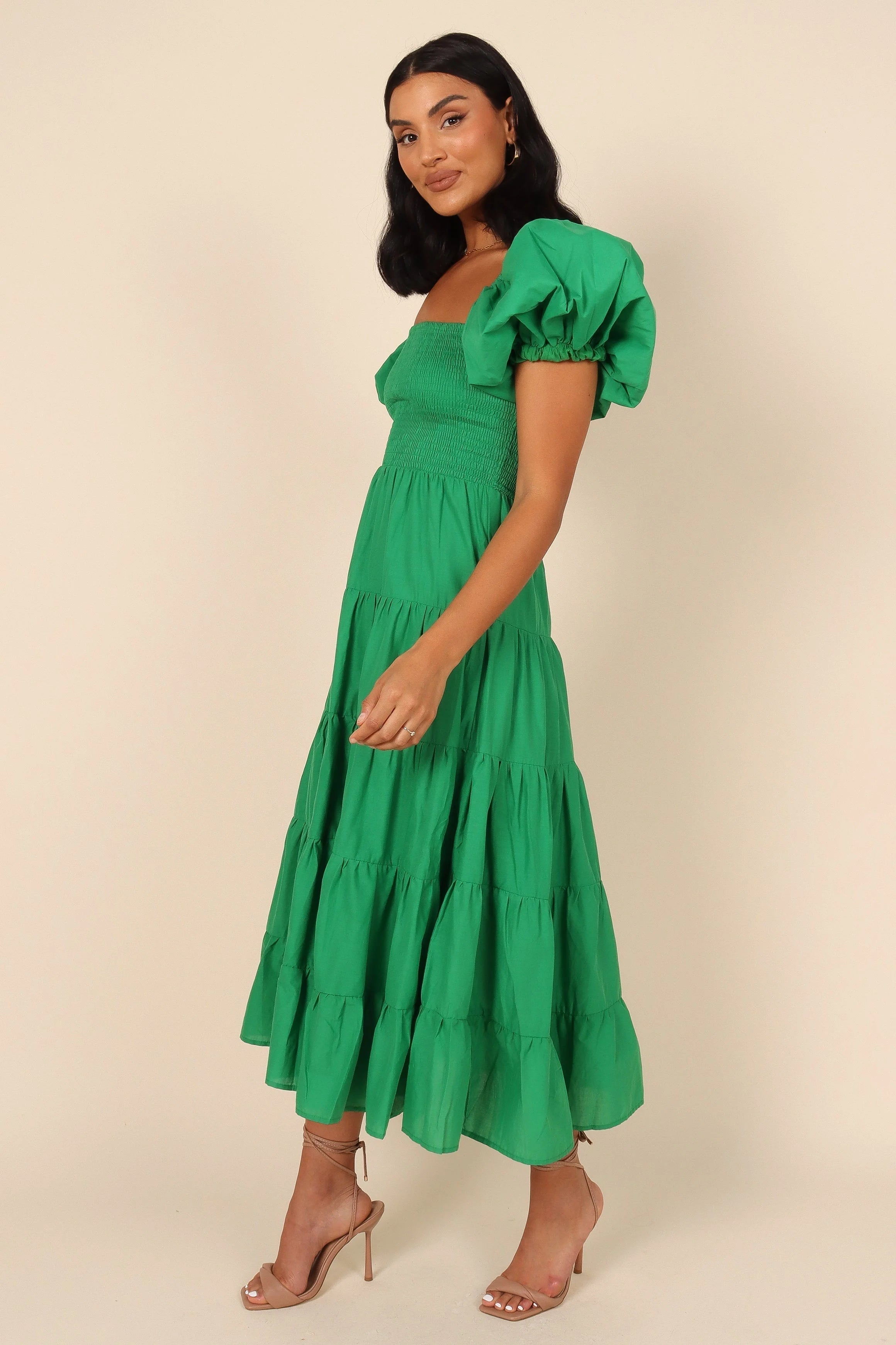 DETAILS This midi length dress is the perfect statement piece for your next party! The square neckline and short sleeves with elasticized cuffs give it a classic silhouette, while the shirred bodice and drop-tier A-line skirt work together to create an ultra-feminine look.