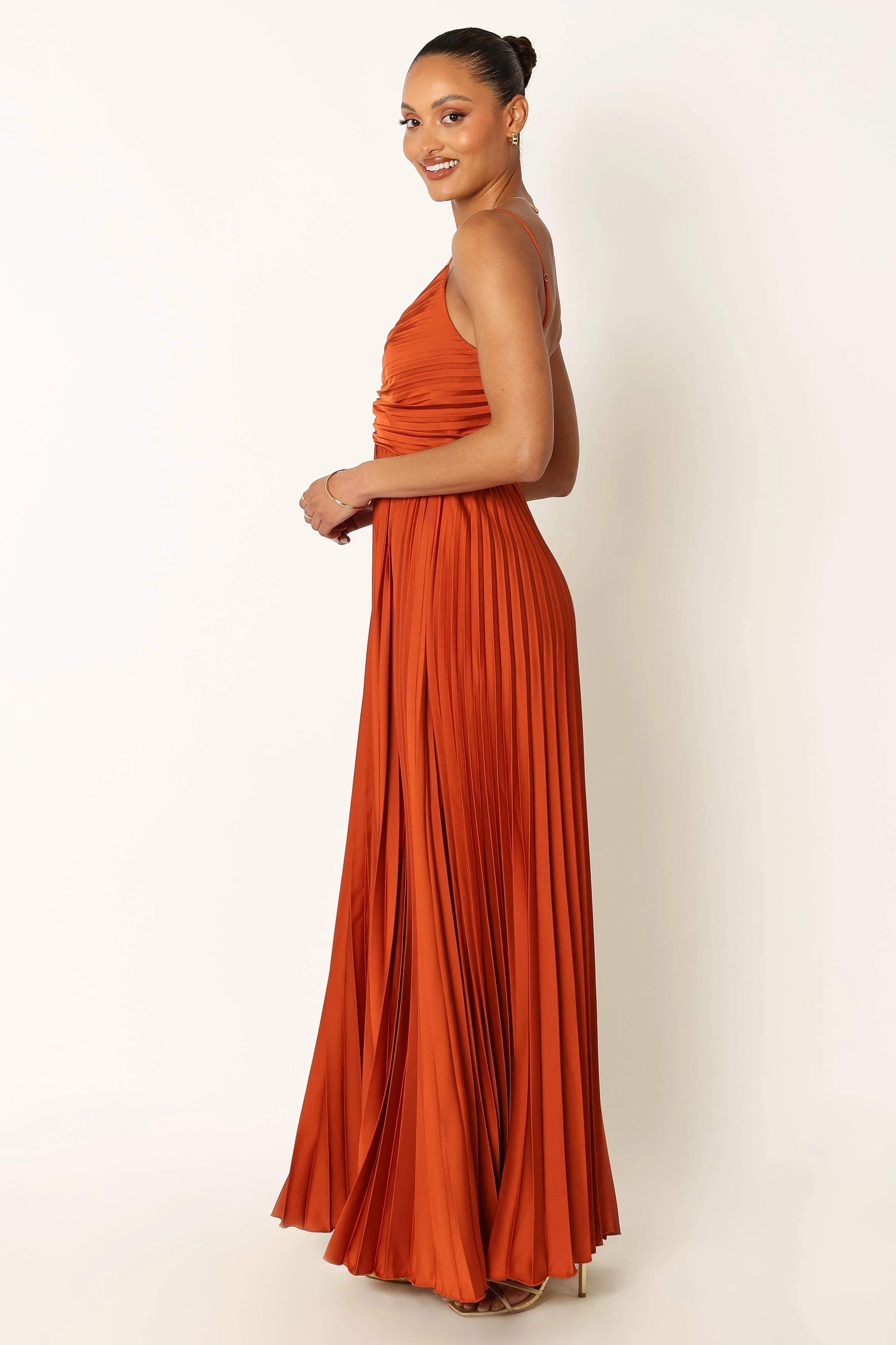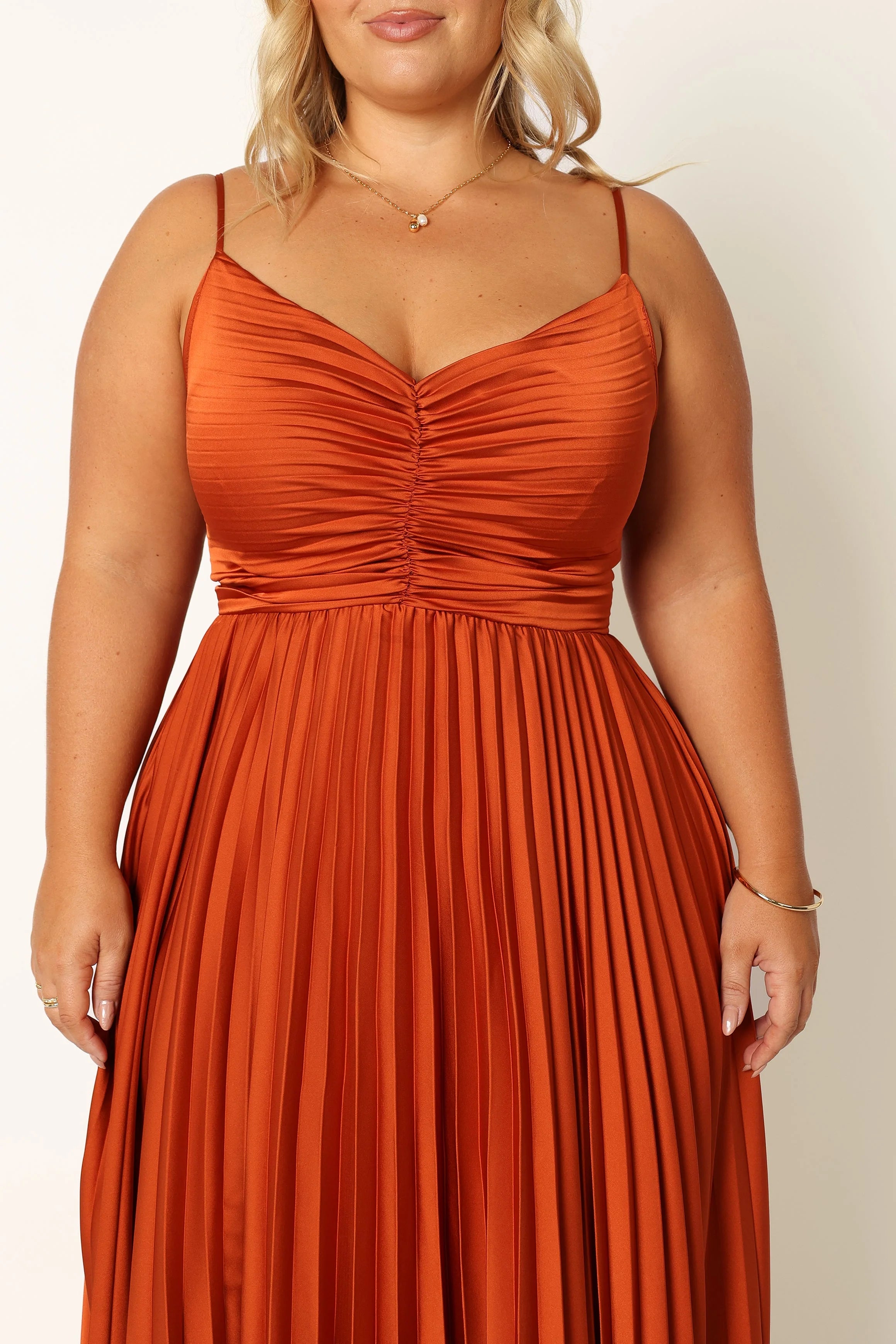 DETAILS This elegant maxi dress is the perfect choice for any special occasion. It features a v neckline, thin adjustable straps and a back invisible zip with hook and eye clasp for an easy fit. The pleated satin fabric has a soft feel that will make you look and feel fabulous all night long. Make a statement at your next party in this stunning maxi dress!