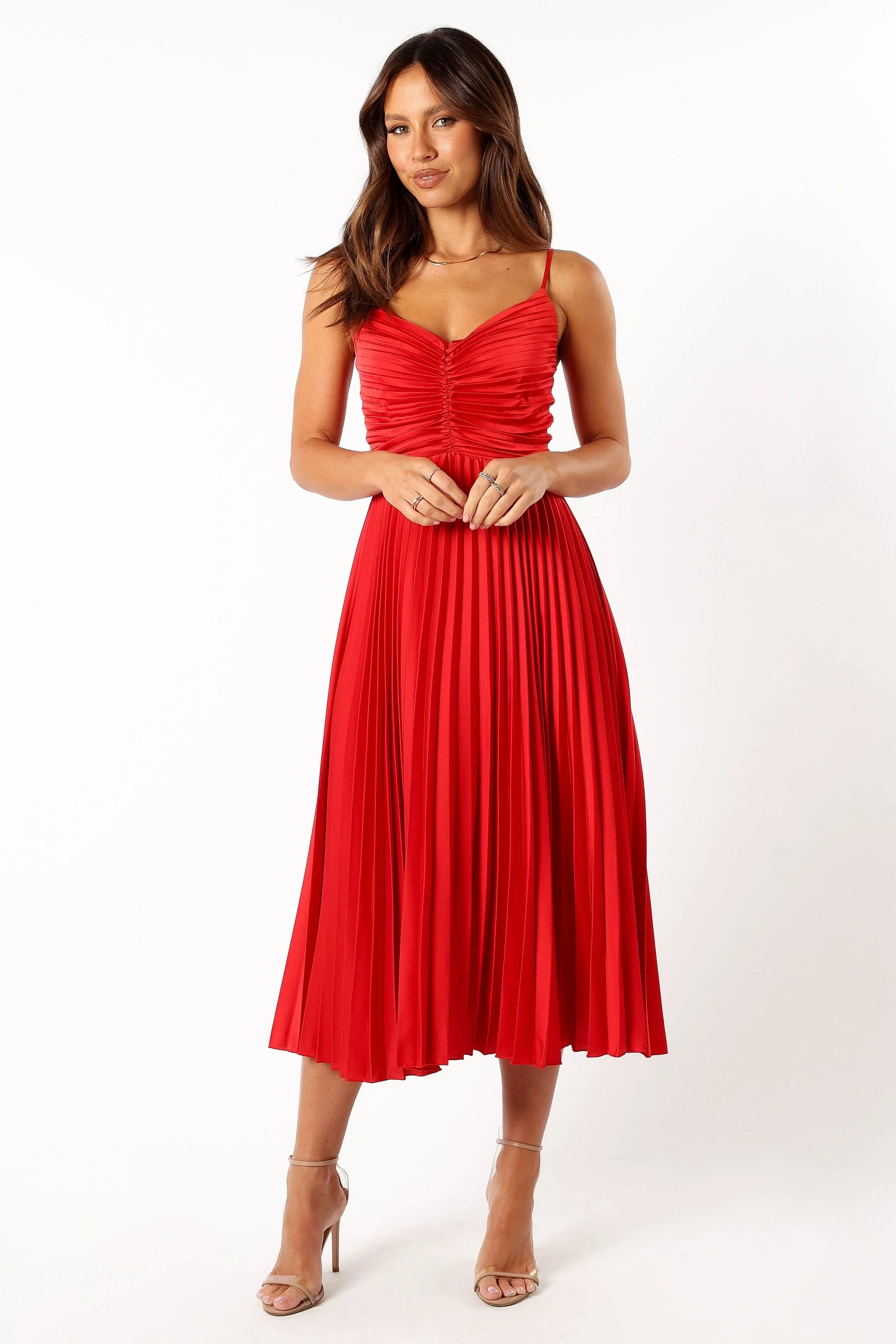 | DETAILS This elegant midi dress is the perfect choice for any special occasion. It features a v neckline, thin adjustable straps and a back invisible zip with hook and eye clasp for an easy fit. The pleated satin fabric has a soft feel that will make you look and feel fabulous all night long. Make a statement at your next party in this stunning midi dress!